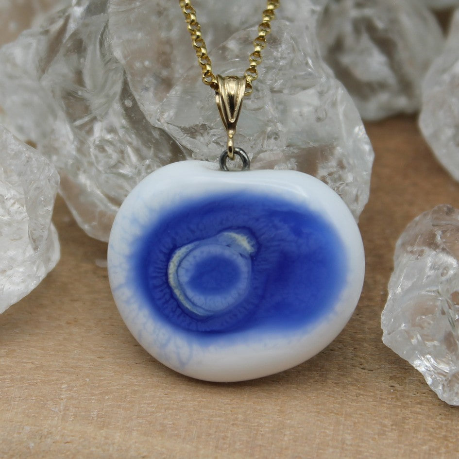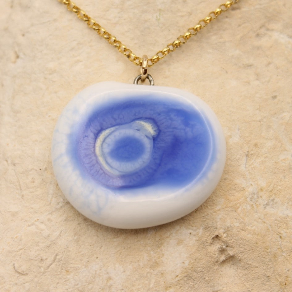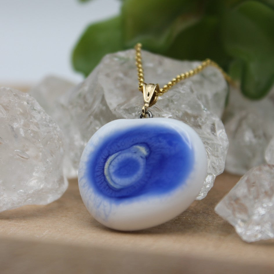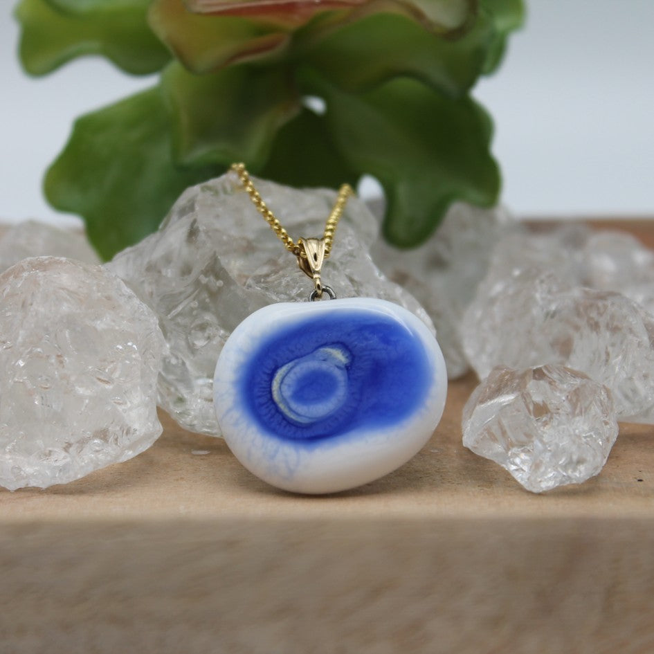 Deze hanger is ovaalvormig en heeft een prachtig blauwe tekening die een beetje aan een oog doet denken. De achterkant van deze hanger is wit.