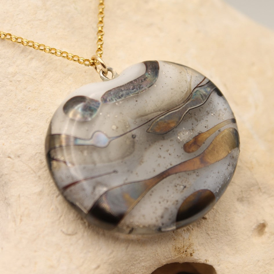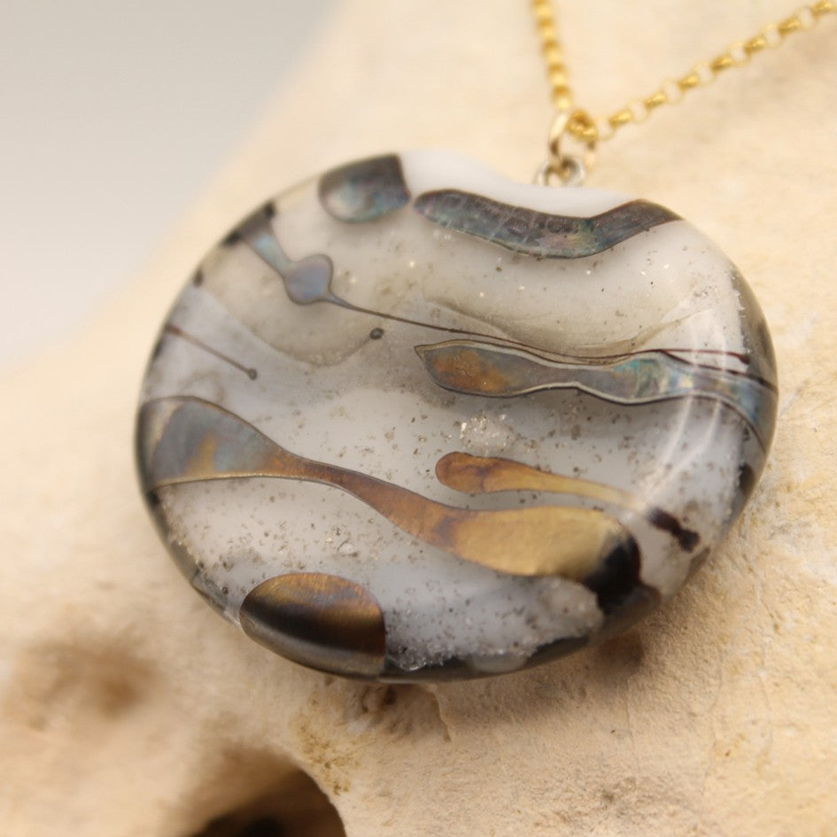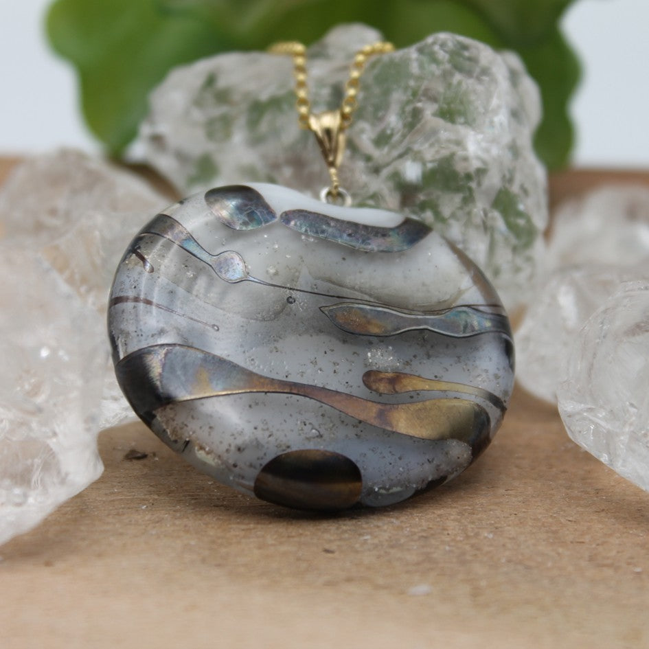 Deze grote hanger heeft schakeringen van diverse kleuren, zoals koper, zilver en wit, en heeft ook enkele doorzichtige stukken, waardoor je een mooi diepte-effect krijgt.