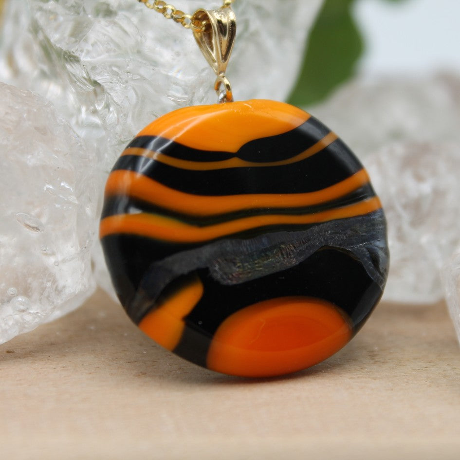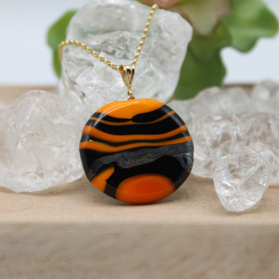 Deze hanger is opvallend oranje van kleur met zwarte golvende lijnen.