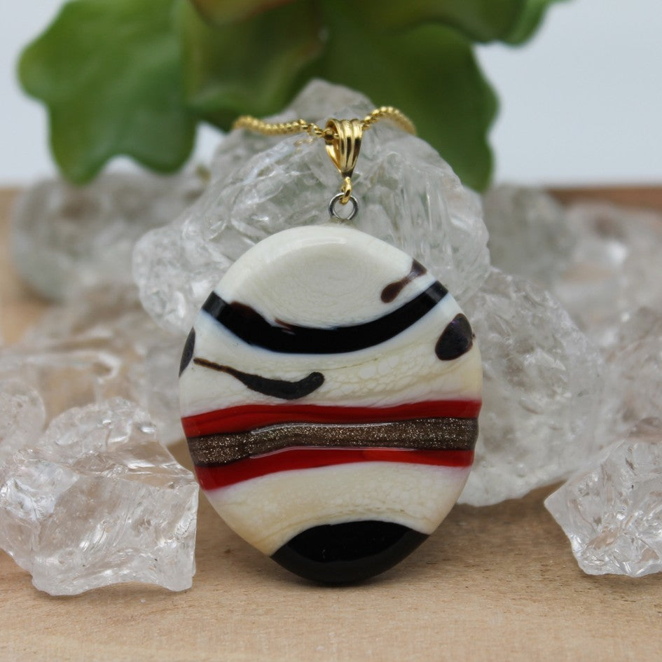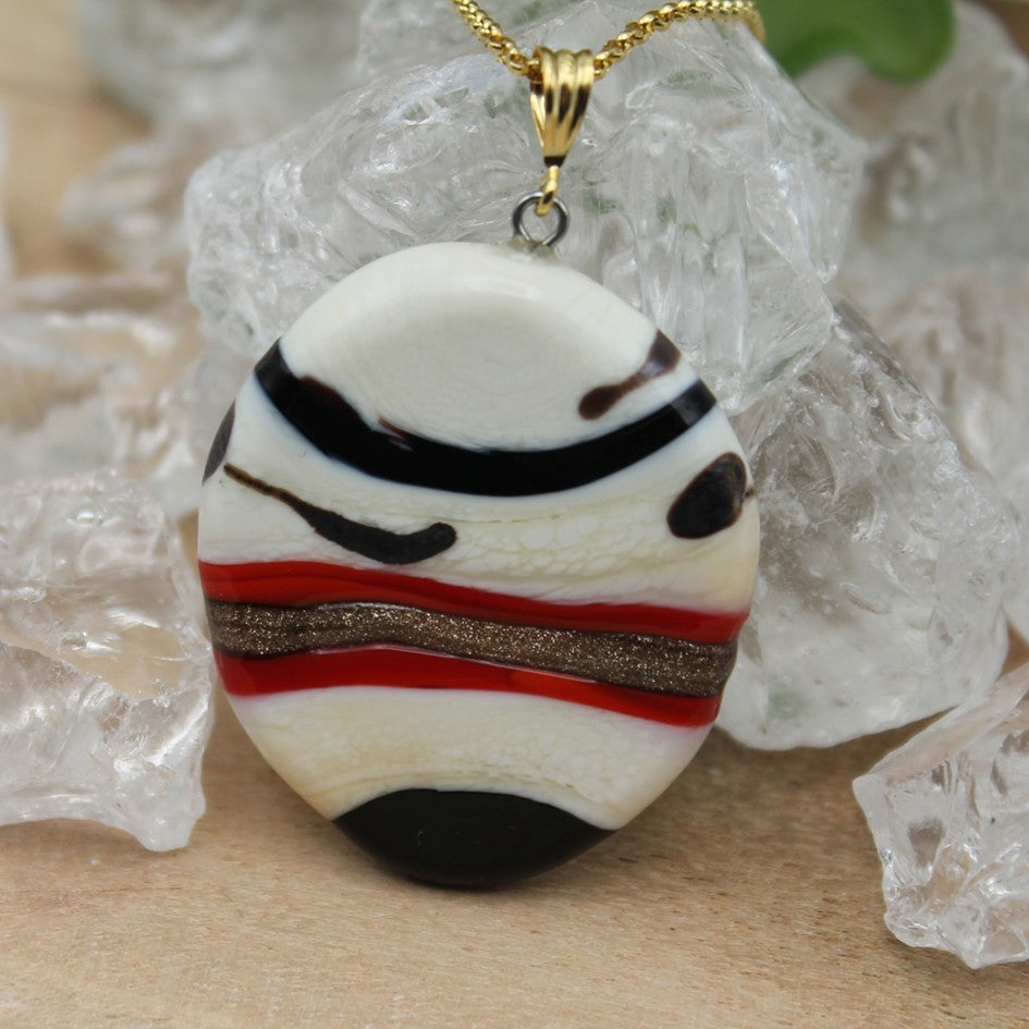 Deze grote ovale hanger is hoofdzakelijk wit met een opvallend rode lijn en enkele zwarte lijnen. Sommige lijnen geven zelfs een zilverkleurige schijn in het licht.