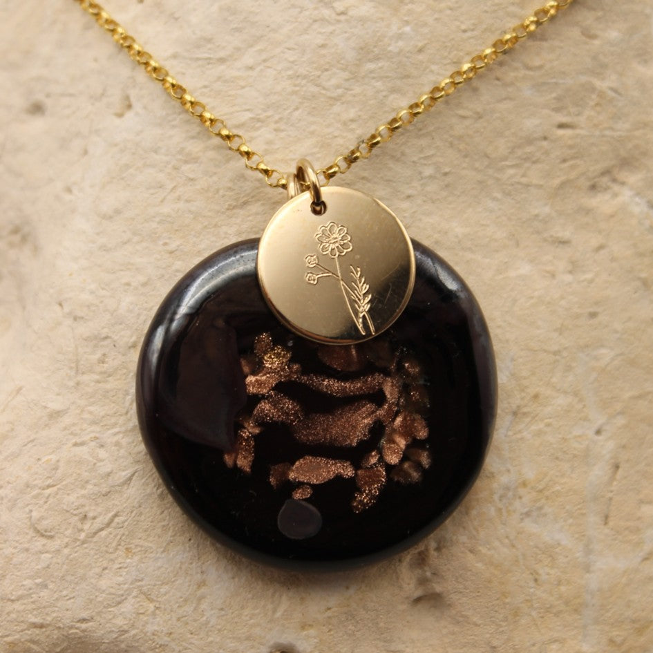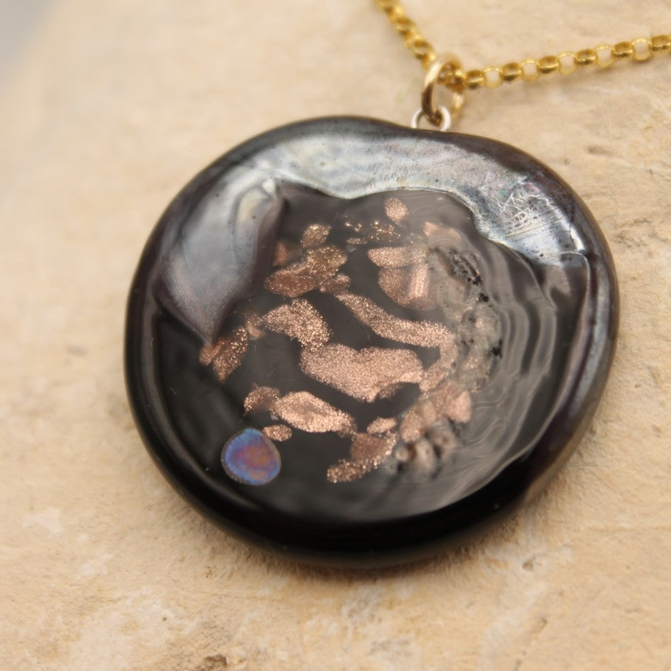 Deze hanger is hoofdzakelijk zwart van kleur en heeft in het midden opvallende accenten van koper die schitteren in het licht.