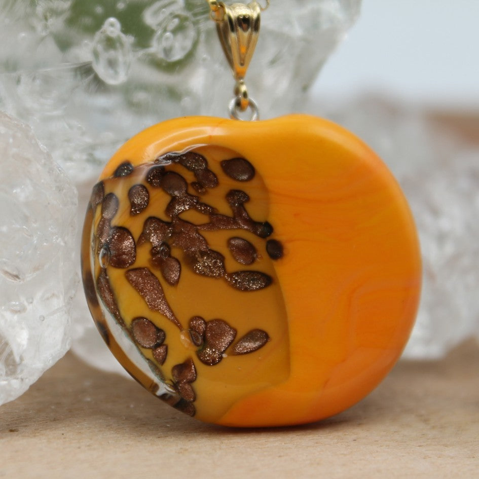 Deze hanger heeft een oranje kleur met aan één zijde koperkleurige accenten die schitteren in het licht. Een klein stukje aan de zijkant is zelfs helemaal doorschijnend.