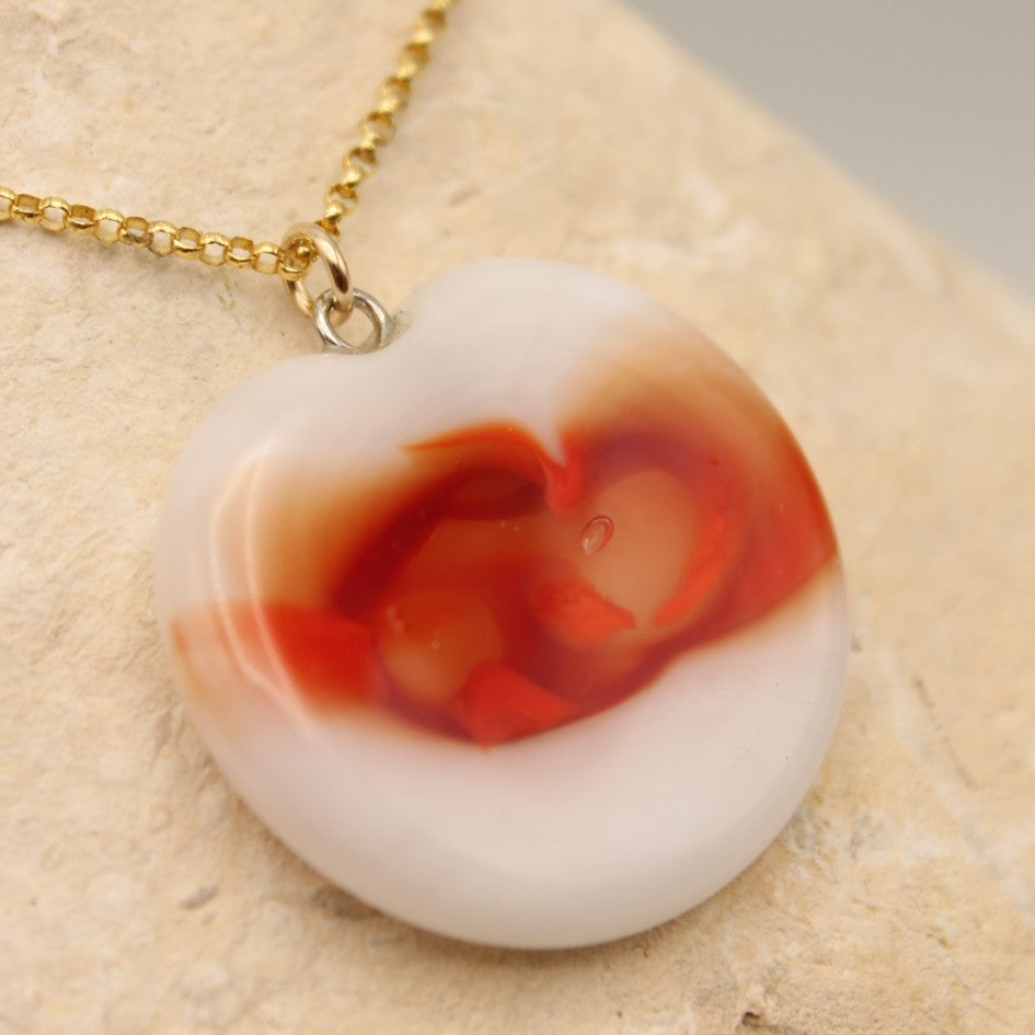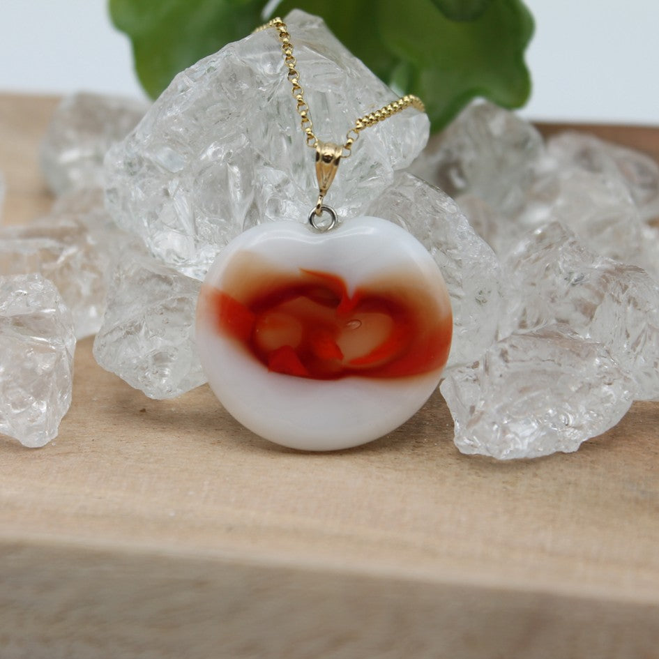 Deze hanger is wit met in het midden een opvallend oranje tekening. De achterkant van deze hanger is volledig wit.