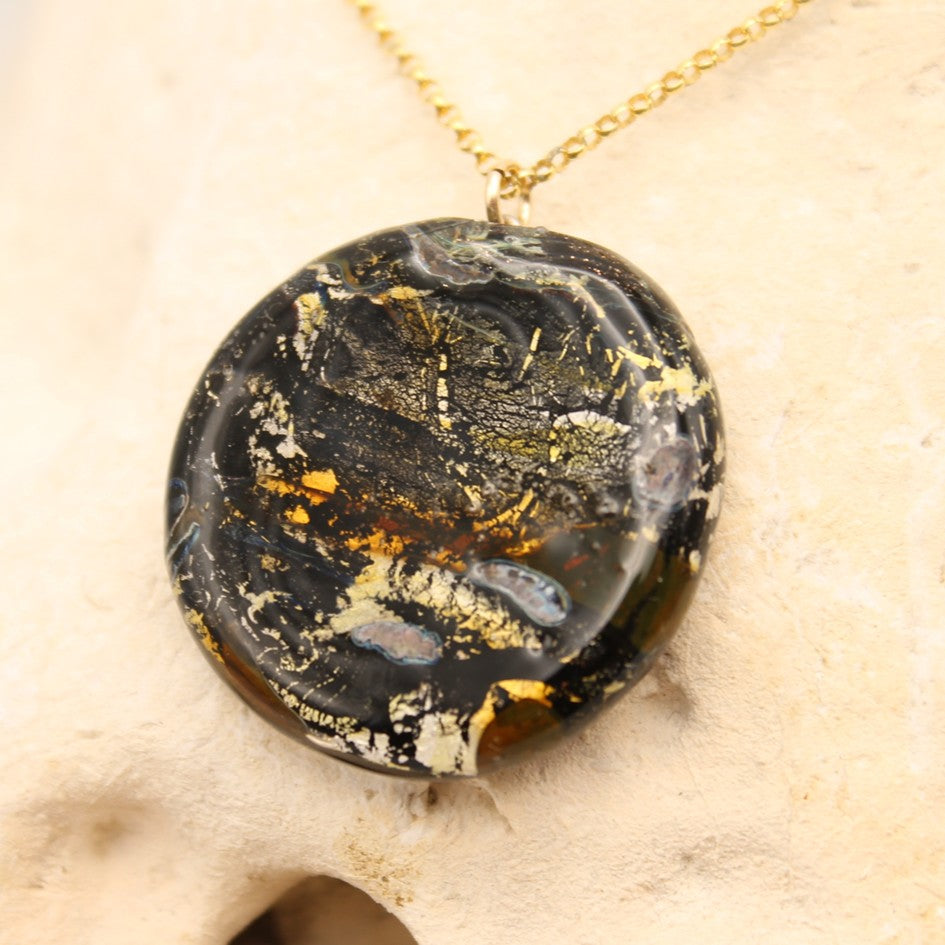 Deze hanger is donker van kleur met accenten in een bijzonder rijk kleurenpallet van goudkleurig, koper en wit.